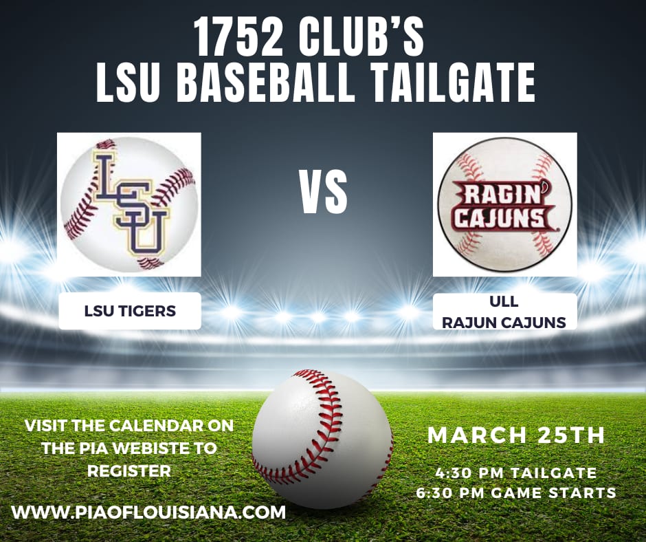 The Louisiana 1752 Club invites you to a LSU Baseball Tailgate Party. Come join us as we cheer on the LSU tigers when they take on the ULL Rajun Cajuns on Tuesday, March 25, 2025.