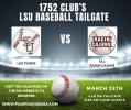 The Louisiana 1752 Club invites you to a LSU Baseball Tailgate Party. Come join us as we cheer on the LSU tigers when they take on the ULL Rajun Cajuns on Tuesday, March 25, 2025. We will tailgate in the Old Front Nine lot prior to the game. SRO ...